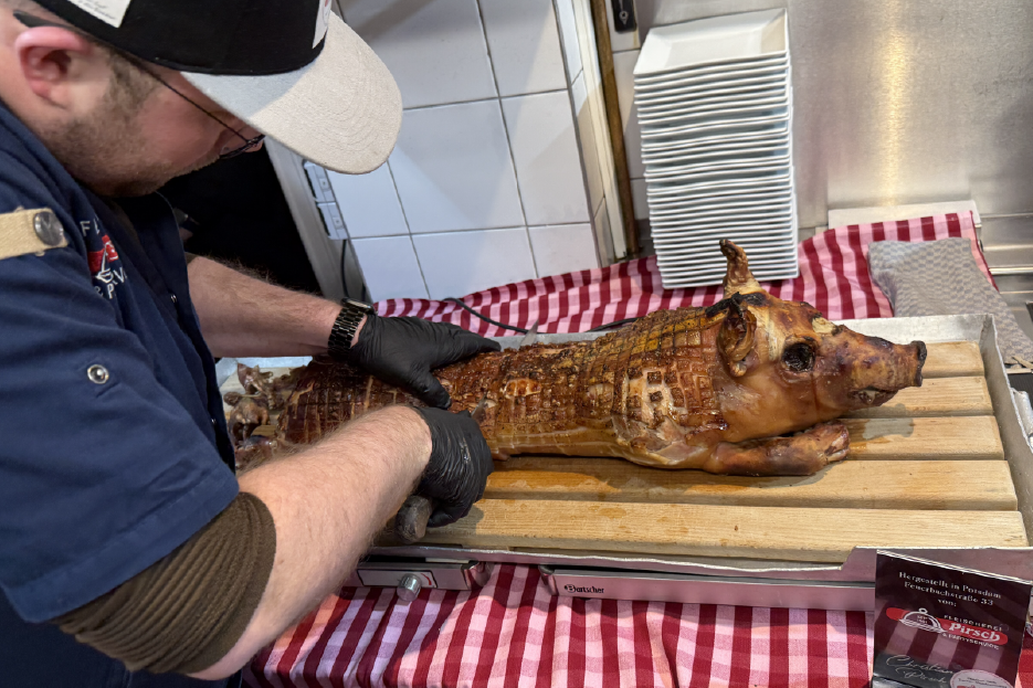 Bei uns werden nur Tiere aus regionaler Haltung und in speziellen Garverfahren verarbeitet. So werden unsere Spanferkel stets sehr zart, saftig und kross. Das gebackene Spanferkel kommt immer ohne Knochen auf den Tisch.